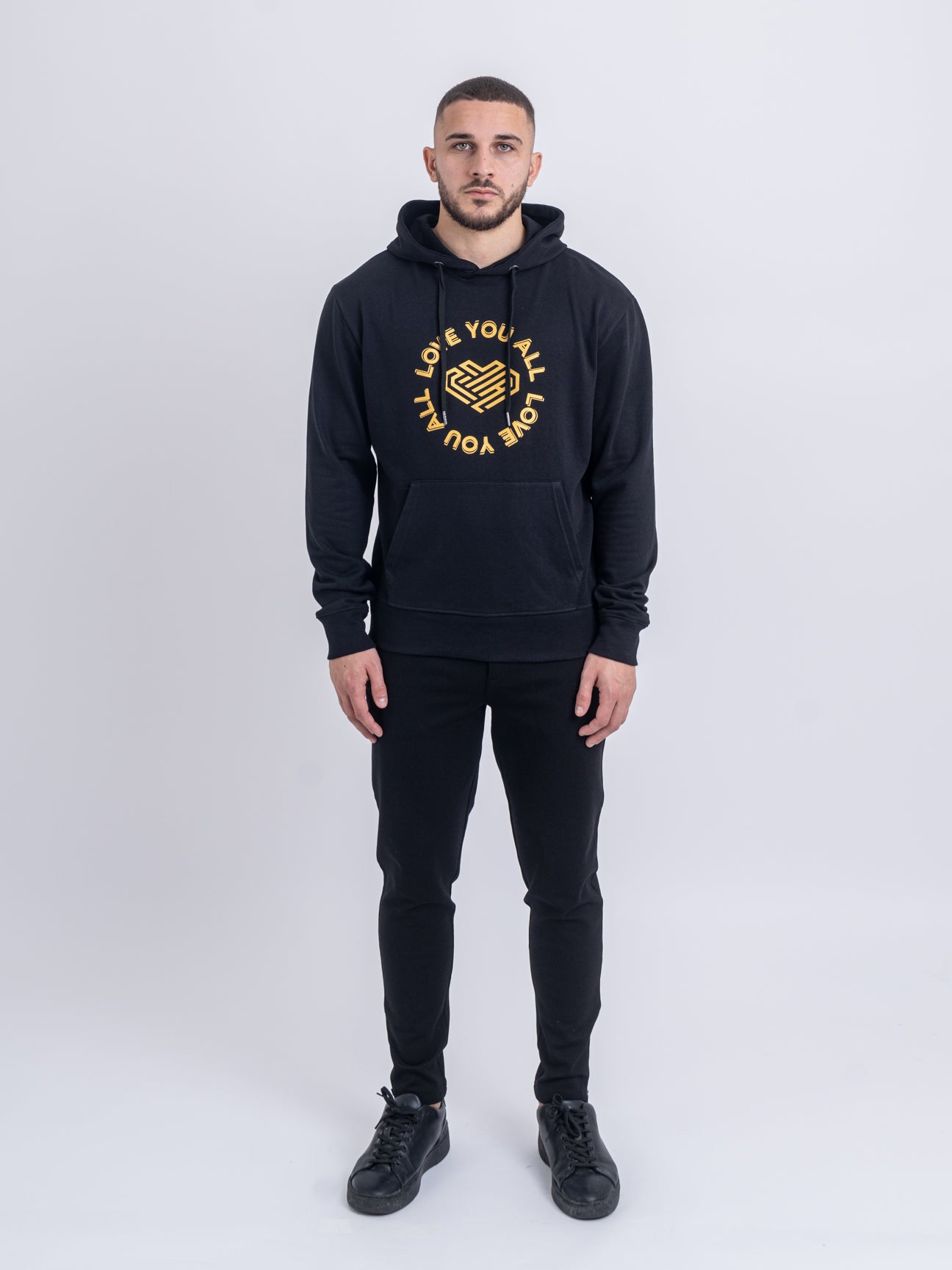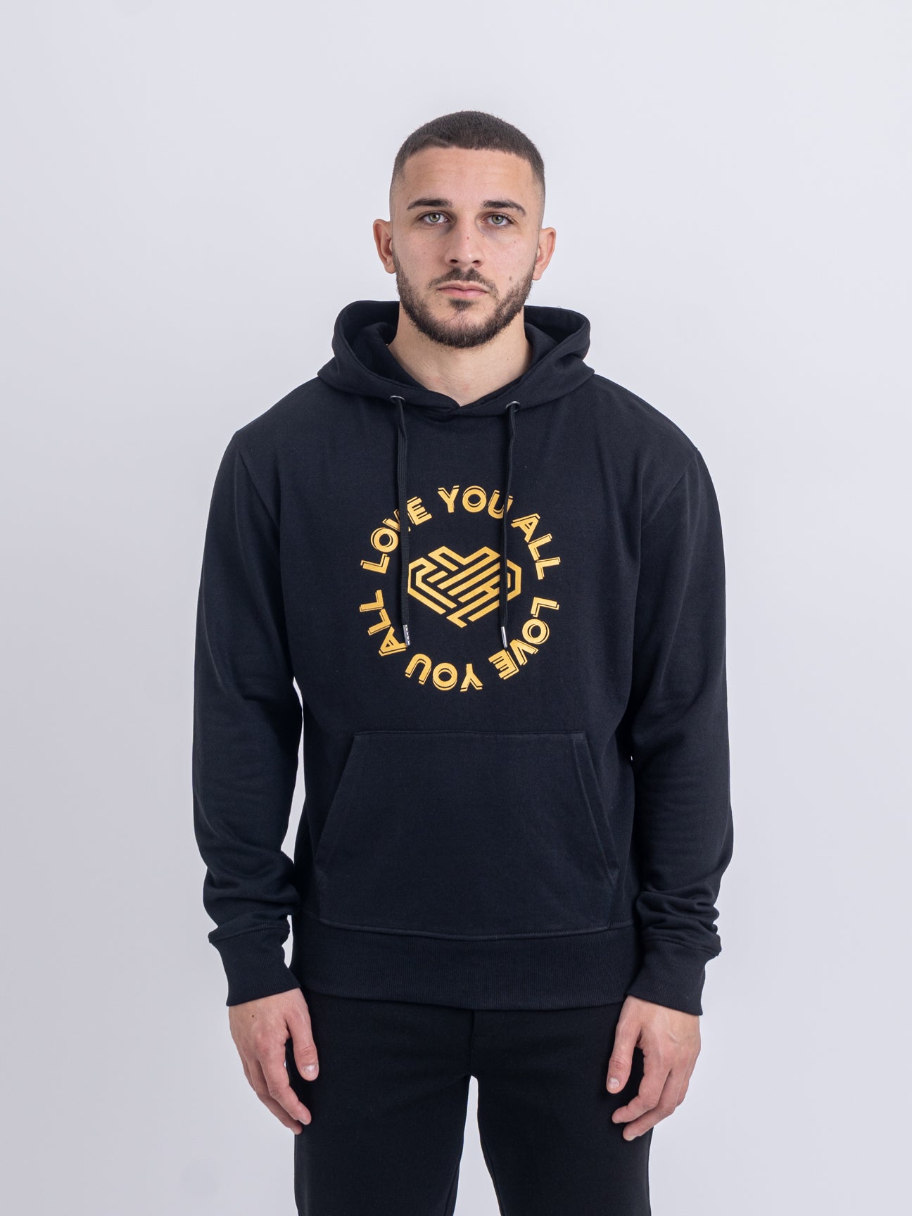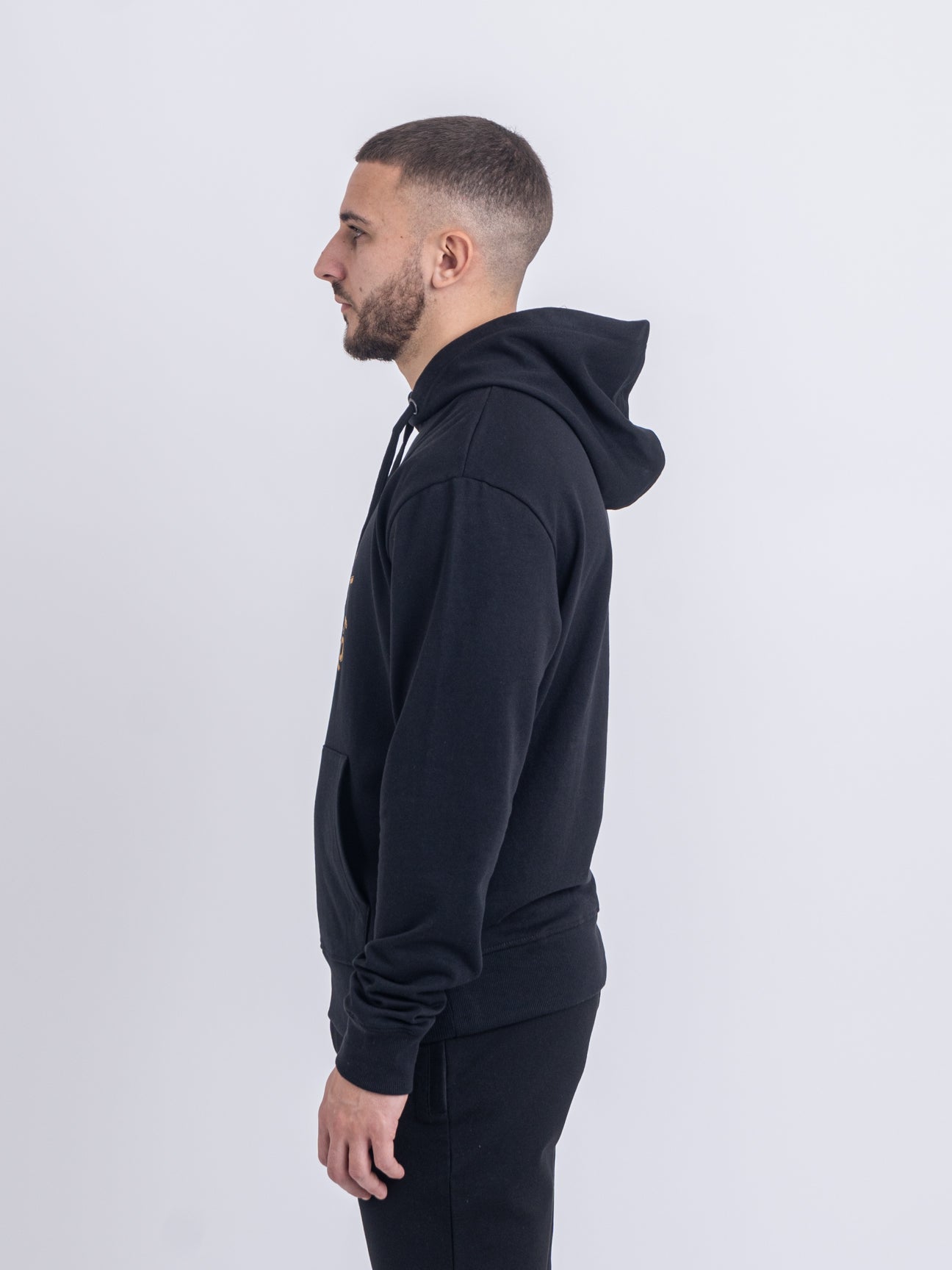 Elevate your essentials with the Golden Icon Hoodie — a timeless black pullover accented with our signature logo in a striking gold glossy print. This piece combines everyday comfort with standout style, making it a wardrobe staple that transitions effortlessly from day to night.