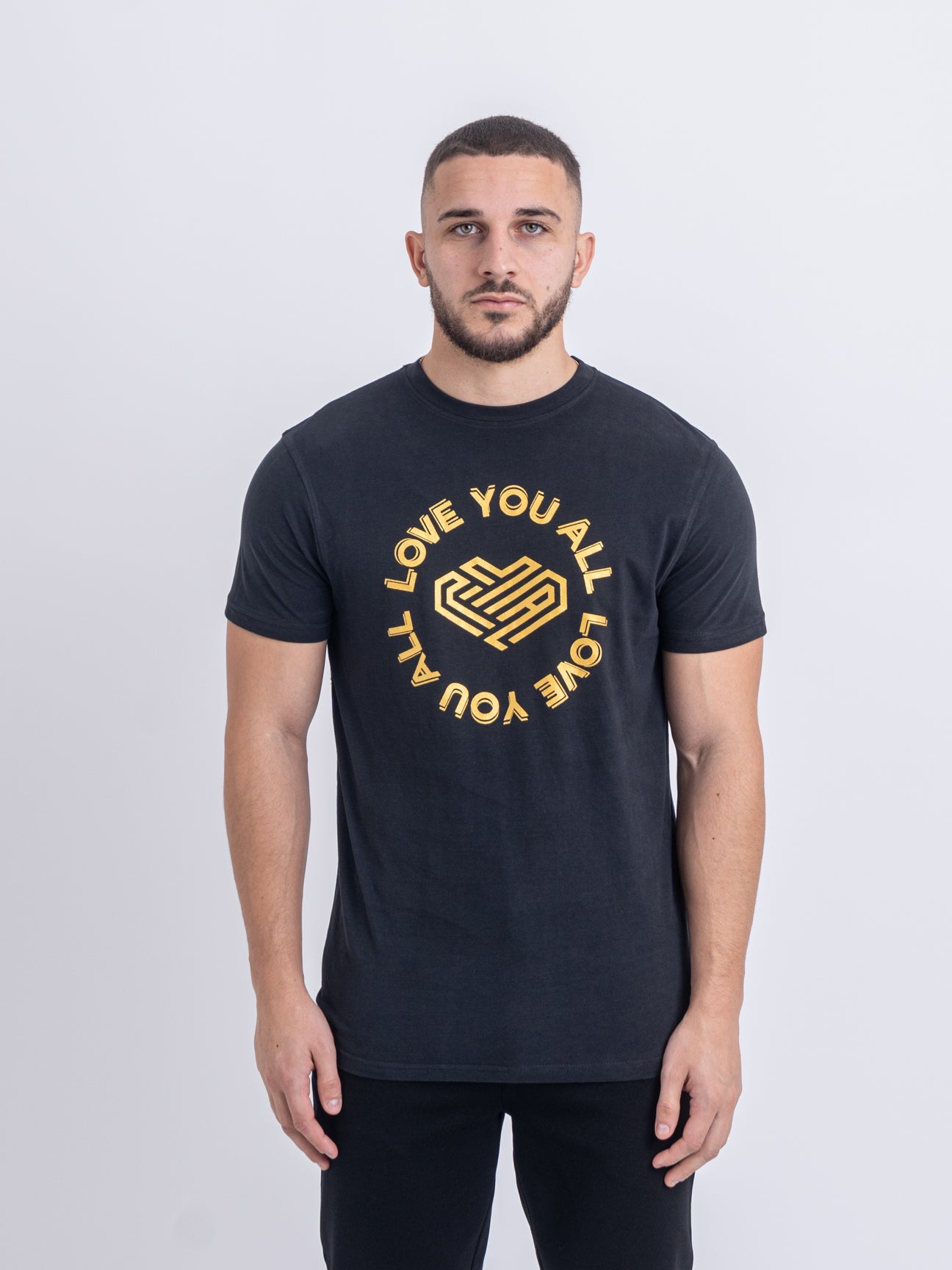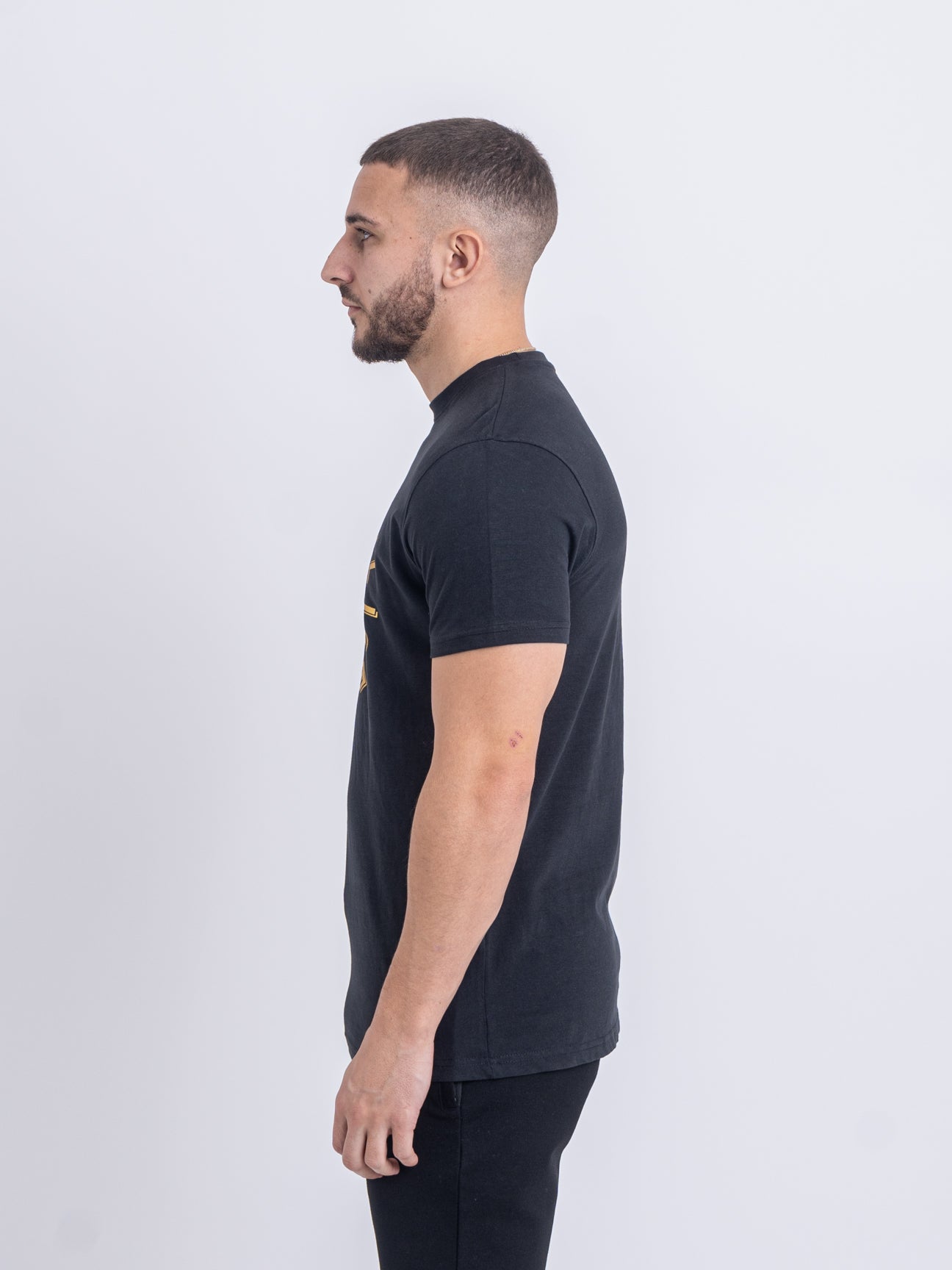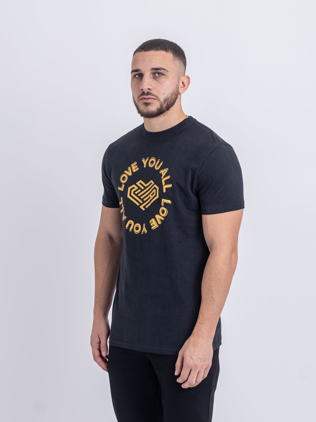 Elevate your wardrobe with the Golden Ring Tee, featuring LYA’s trademarked brand icon in a striking gold glossy screen print. Crafted from 100% cotton, this comfort-fit black t-shirt offers a ribbed crew neck and short sleeves for versatile, all-day wear. The ultra-smooth peach finish ensures a soft, fresh feel, making it perfect for casual days or nights out.