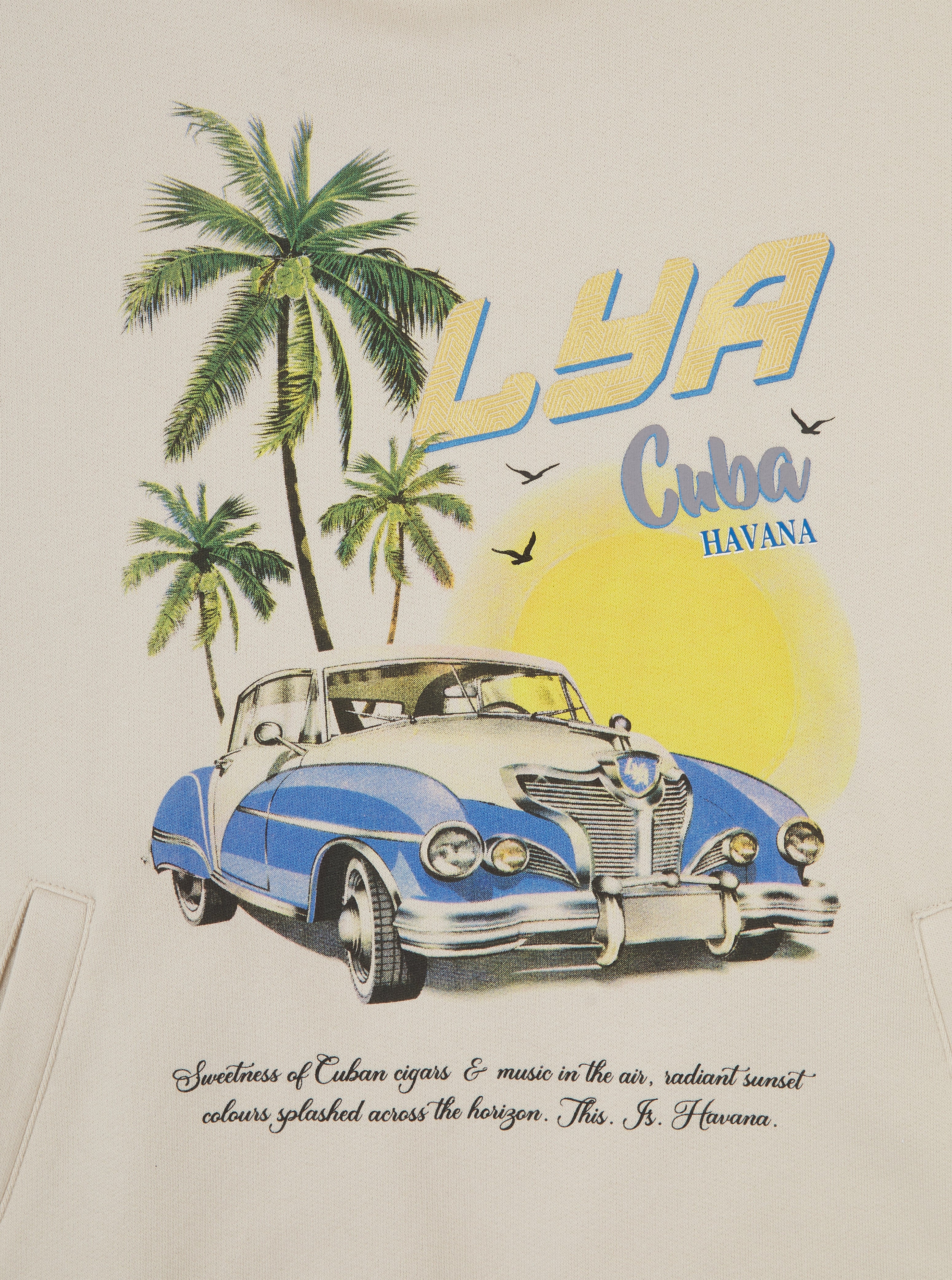 The standout screen print features the signature LYA design, complete with sun, beach, and retro car artwork—a nod to Havana’s bold and carefree spirit. Two waist slip pockets add practicality, while ribbed cuffs, hem, and an adjustable hood provide the perfect fit and long-lasting shape.