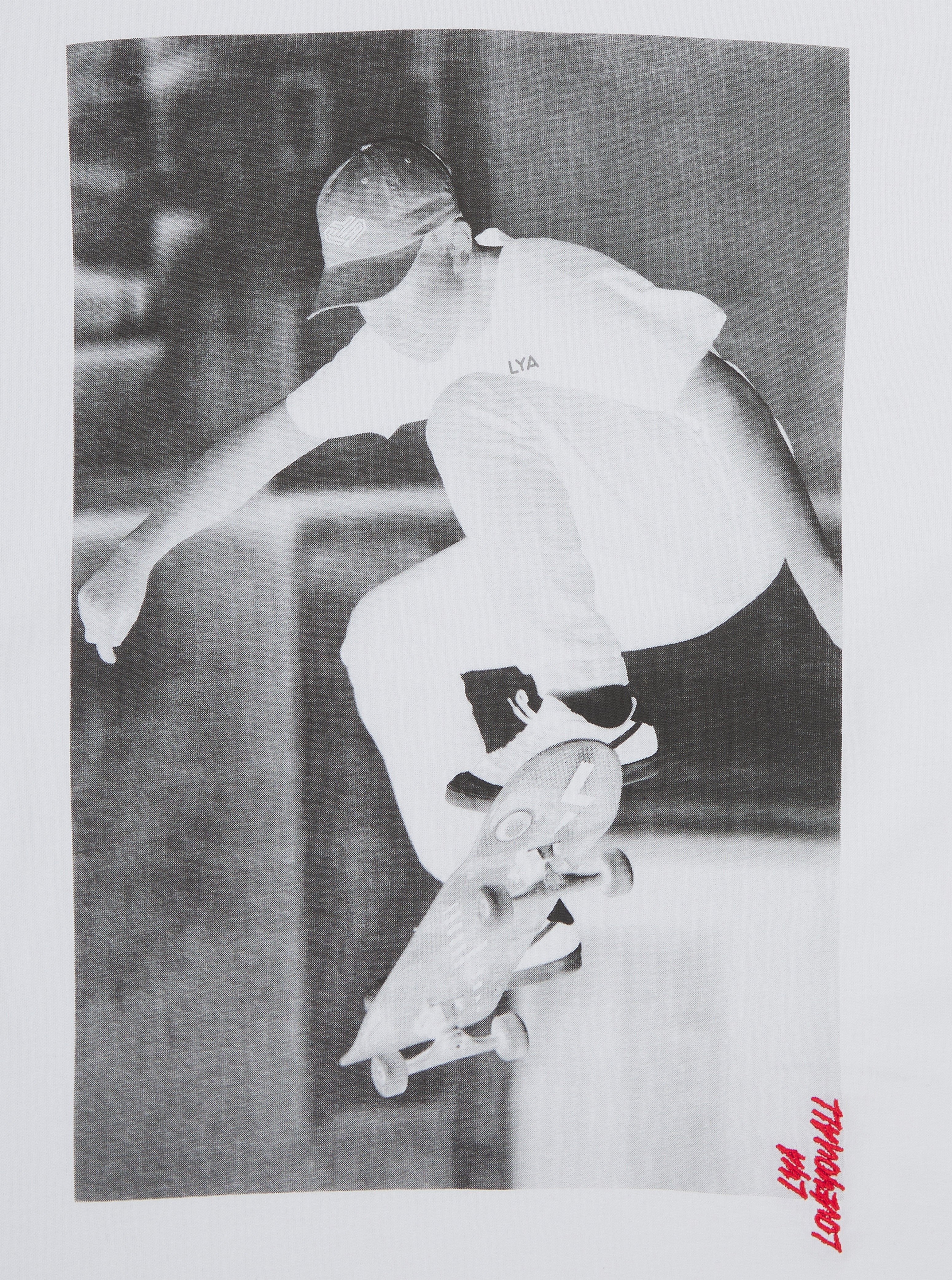 Designed with a ribbed crew neckline and short sleeves for flexibility, it features a skateboarding-inspired digital print with the loveyouall signature, enhanced by fine embroidery for texture. A woven brand icon patch on the left hem adds a subtle finishing touch.